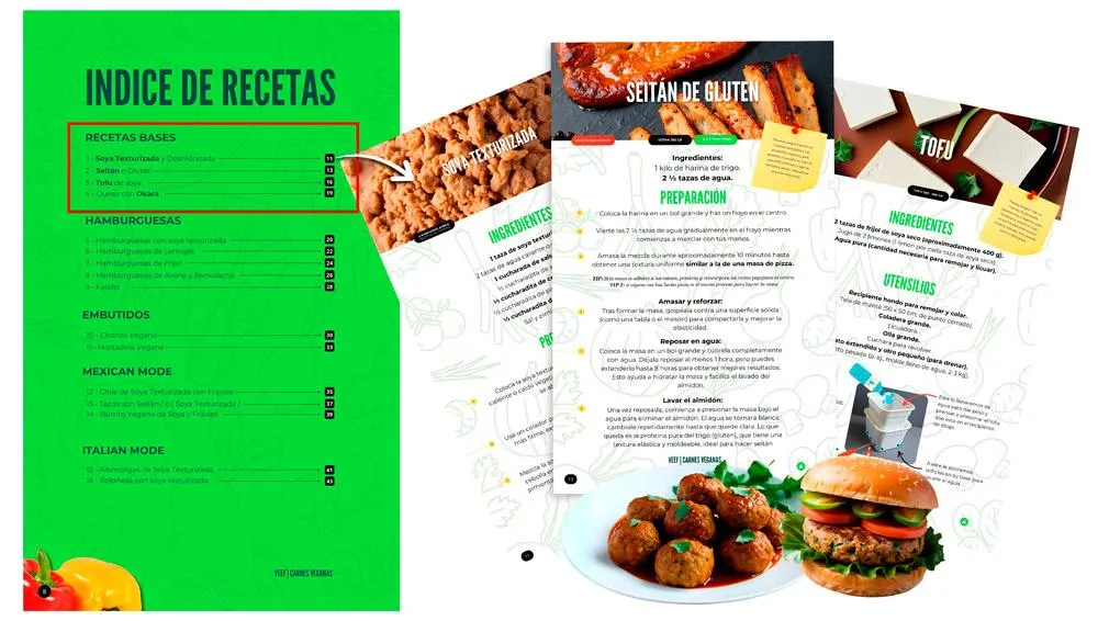 Te mostraré como con ingredientes sencillos podrás crear desde unas albondigas a base de soya texturizada, hasta un delicioso filete de seitán.